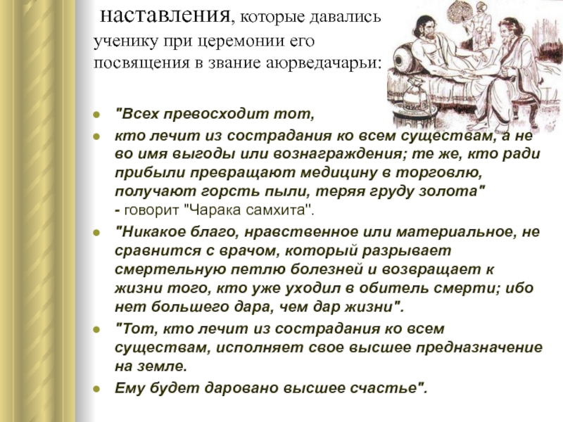 а не во имя выгоды или вознаграждения; те же, кто ради прибыли превращают медицину в торговлю, получают горсть пыли, теряя груду золота" - говорит "Чарака самхита".