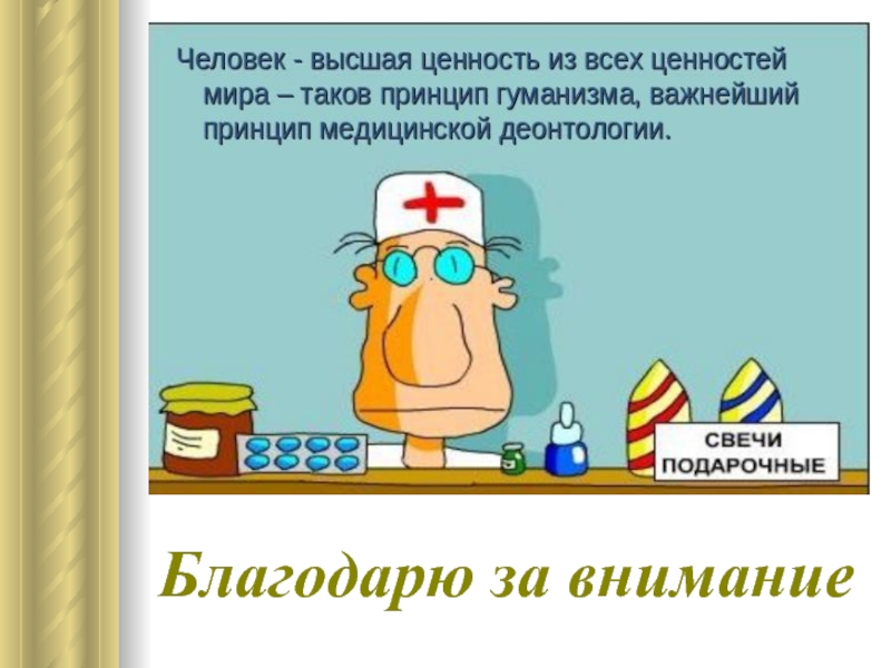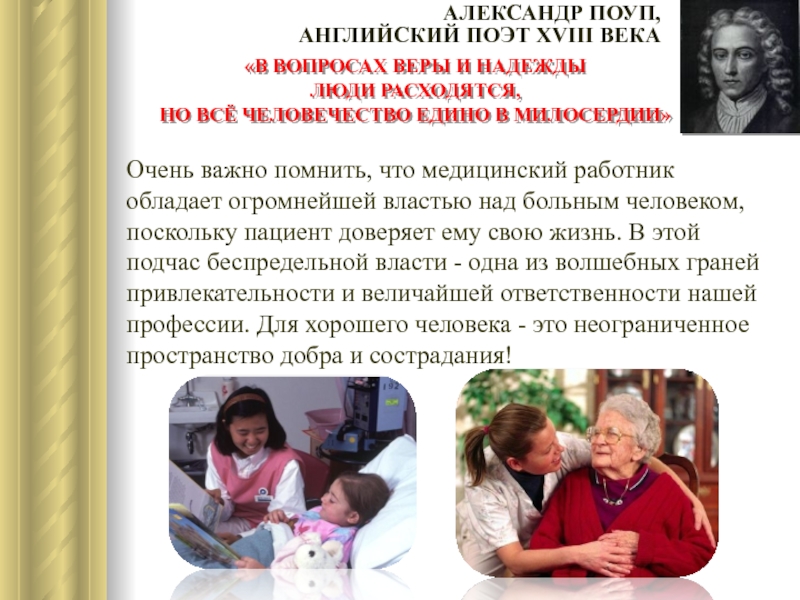 помнить, что медицинский работник обладает огромнейшей властью над больным человеком, поскольку пациент доверяет ему свою жизнь. В этой подчас беспредельной власти - одна из волшебных граней привлекательности и величайшей ответственности нашей профессии. Для хорошего человека - это неограниченное пространство добра и сострадания!