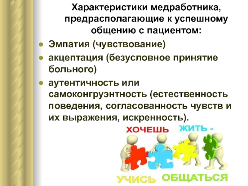 Слайд 7Характеристики медработника, предрасполагающие к успешному общению с пациентом: