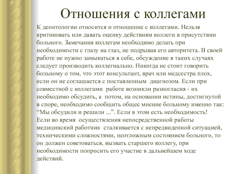 коллегам необходимо делать при необходимости с глазу на глаз, не подрывая его авторитета. В своей работе не нужно замыкаться в себе, обсуждение в таких случаях следует производить коллегиально. Никогда не стоит говорить больному о том, что этот консультант, врач или медсестра плох, если он не соглашается с поставленным диагнозом. Если при совместной с коллегами работе возникли разногласия - их необходимо обсудить, а потом, на основании истины, достигнутой в споре, необходимо сообщить общее мнение больному именно так: “Мы обсудили и решили ...”. Если в этом есть необходимость!
