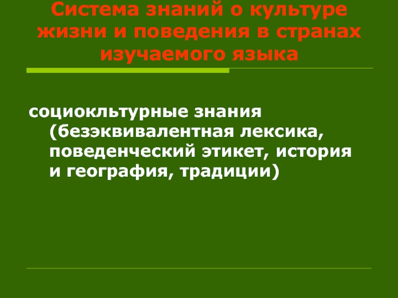 Слайд 19Система знаний о культуре жизни и поведения в странах изучаемого