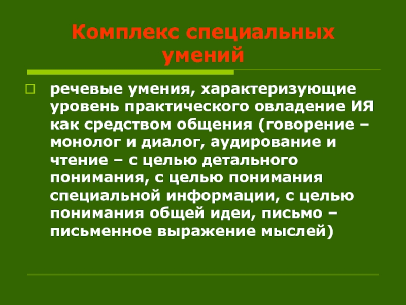 речевые умения, характеризующие уровень практического овладение ИЯ как