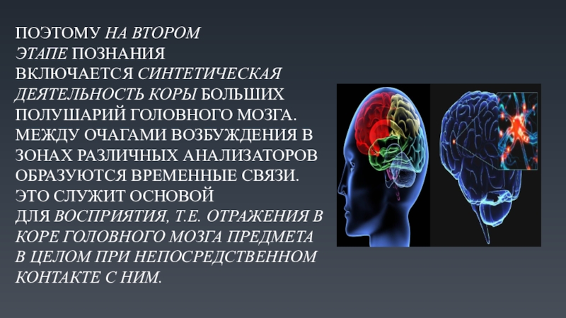 Слайд 5Поэтому на втором этапе познания включается синтетическая деятельность коры больших полушарий головного мозга. Между