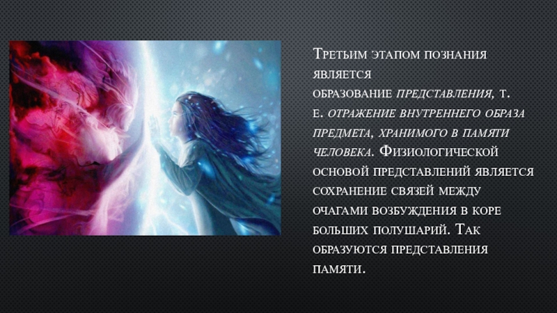 Третьим этапом познания является образование представления, т.е. отражение внутреннего образа предмета, хранимого в памяти человека. Физиологической основой представлений является сохранение связей