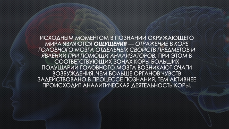Слайд 4Исходным моментом в познании окружающего мира являются ощущения — отражение в коре головного