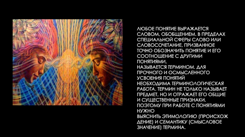 Любое понятие выражается словом, обобщением. В пределах специальной сферы слово или словосочетание, призванное точно обозначить понятие и его соотношение с другими понятиями, называется термином. Для прочного и осмысленного усвоения понятий необходима терминологическая работа. Термин