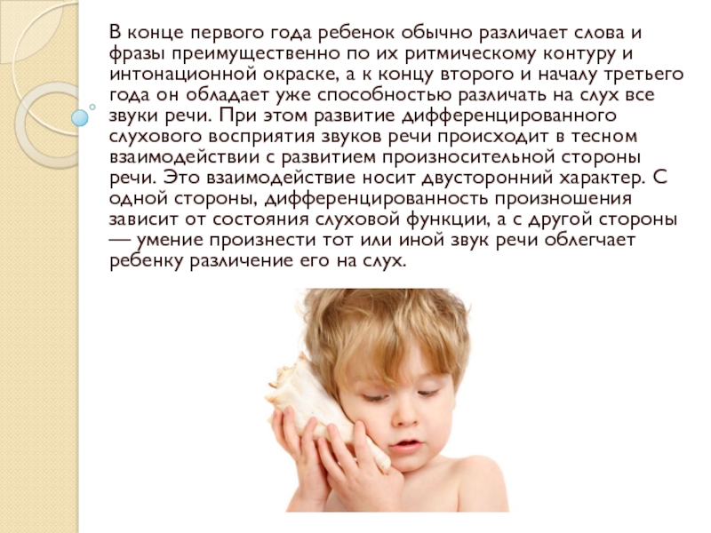 концу второго и началу третьего года он обладает уже способностью различать на слух все звуки речи. При этом развитие дифференцированного слухового восприятия звуков речи происходит в тесном взаимодействии с развитием произносительной стороны речи. Это взаимодействие носит двусторонний характер. С одной стороны, дифференцированность произношения зависит от состояния слуховой функции, а с другой стороны — умение произнести тот или иной звук речи облегчает ребенку различение его на слух.