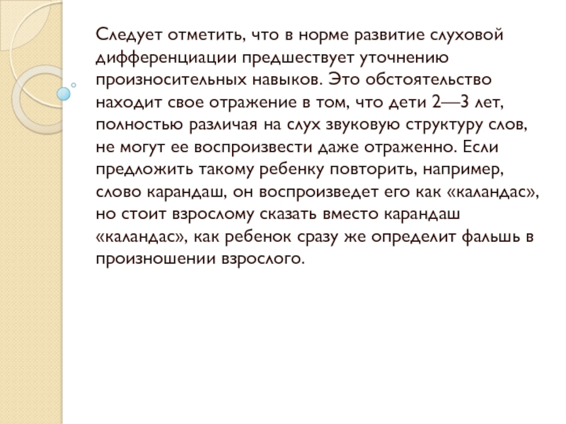 Слайд 6Следует отметить, что в норме развитие слуховой дифференциации предшествует уточнению