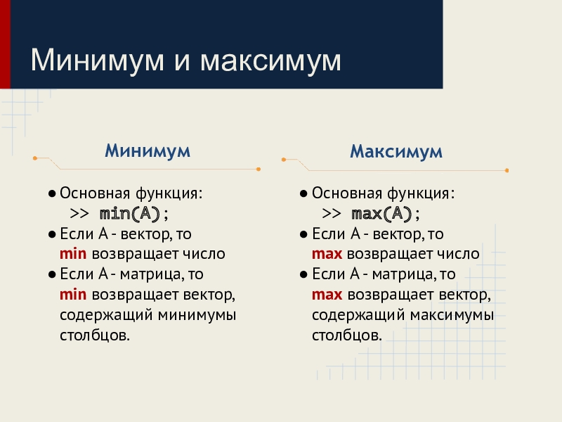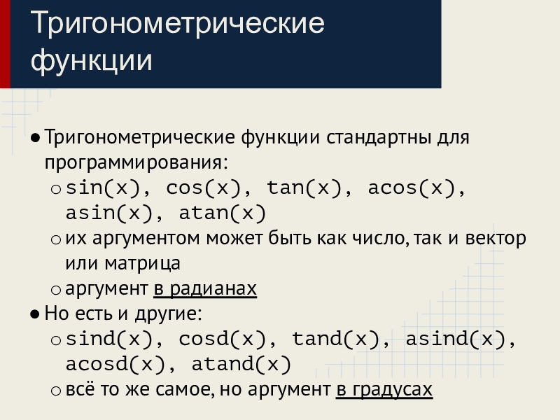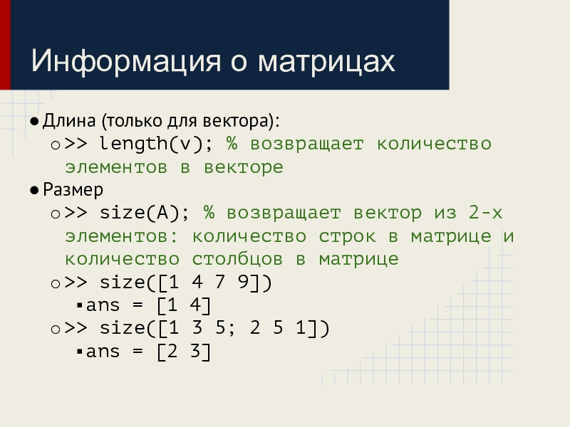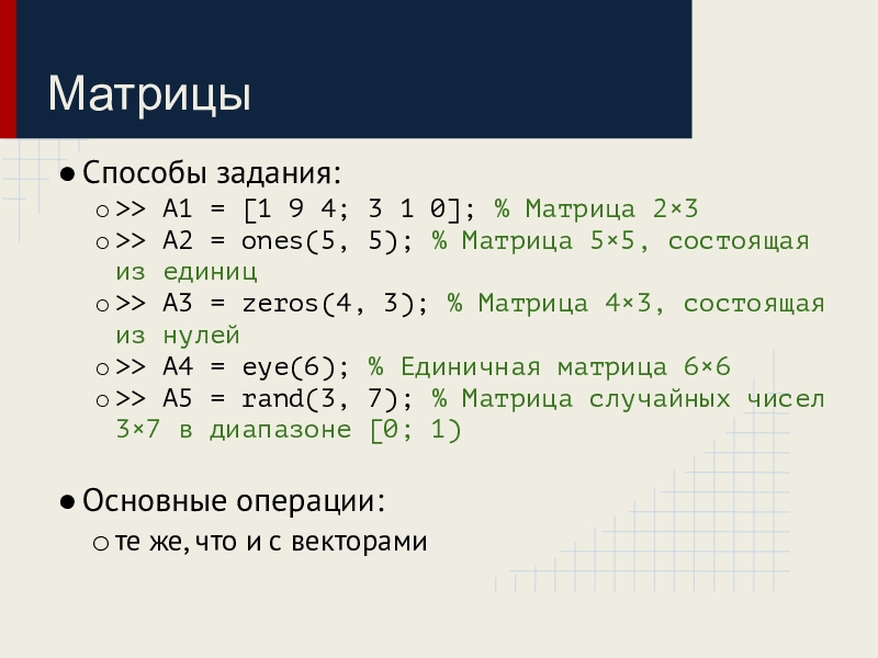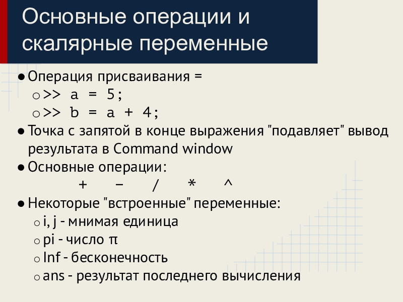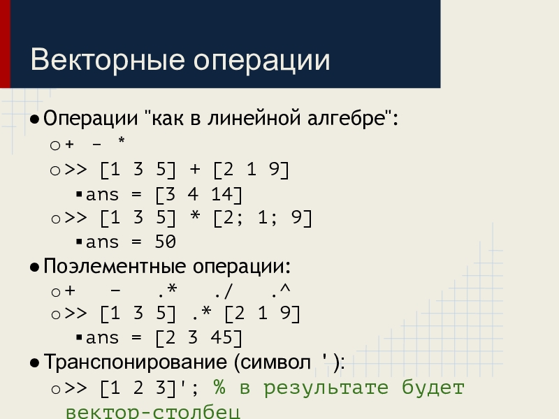 > [1 3 5] +" alt="Операции "как в линейной алгебре":+ − *>> [1 3 5] + [2 1 9]ans = [3 4">![Основные функции и управляющие конструкции