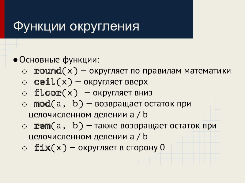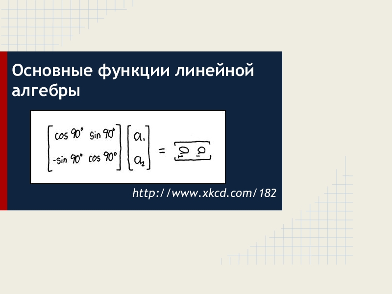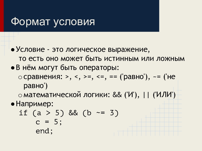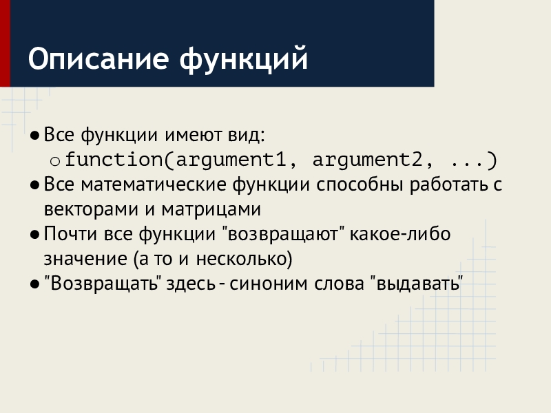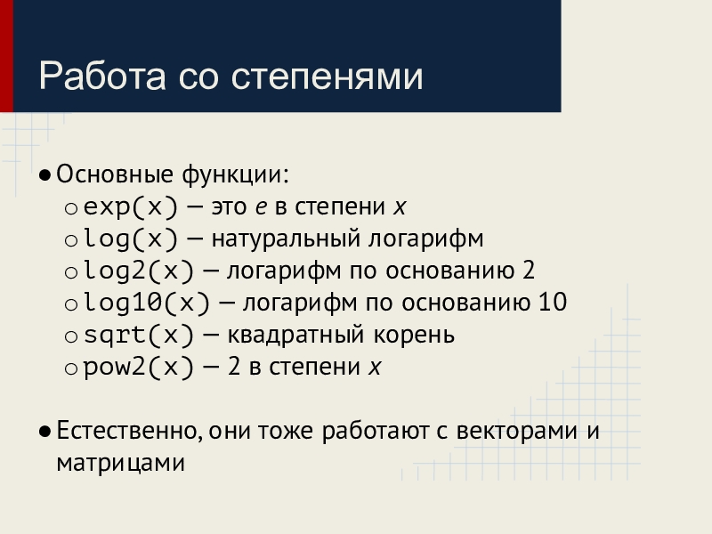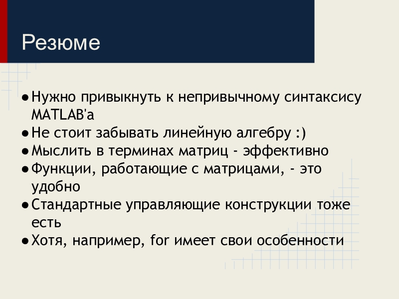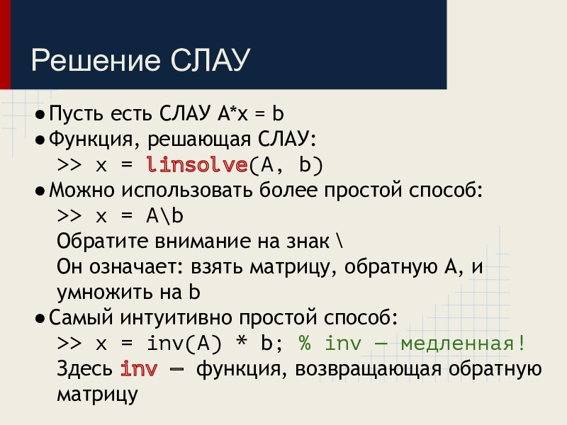 > [1 3 5] +" alt="Операции "как в линейной алгебре":+ − *>> [1 3 5] + [2 1 9]ans = [3 4">![Основные функции и управляющие конструкции