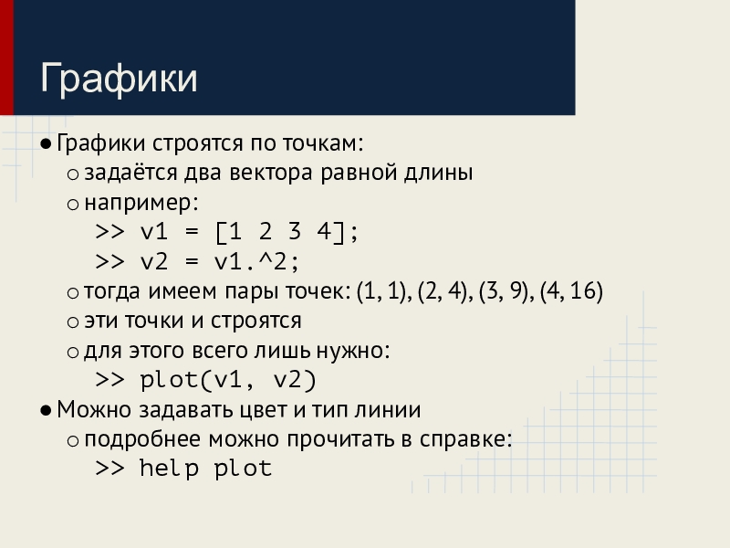 Прикладные программные системы Графики строятся по точкам:задаётся два вектора равной длинынапример:>> v1 = [1 Графики строятся по точкам:задаётся два вектора равной длинынапример:>> v1 = [1 2 3 4];>> v2 = v1.^2;тогда](/img/tmb/7/613305/5312cf25604380256ff4693ca88e6d08-800x.jpg)