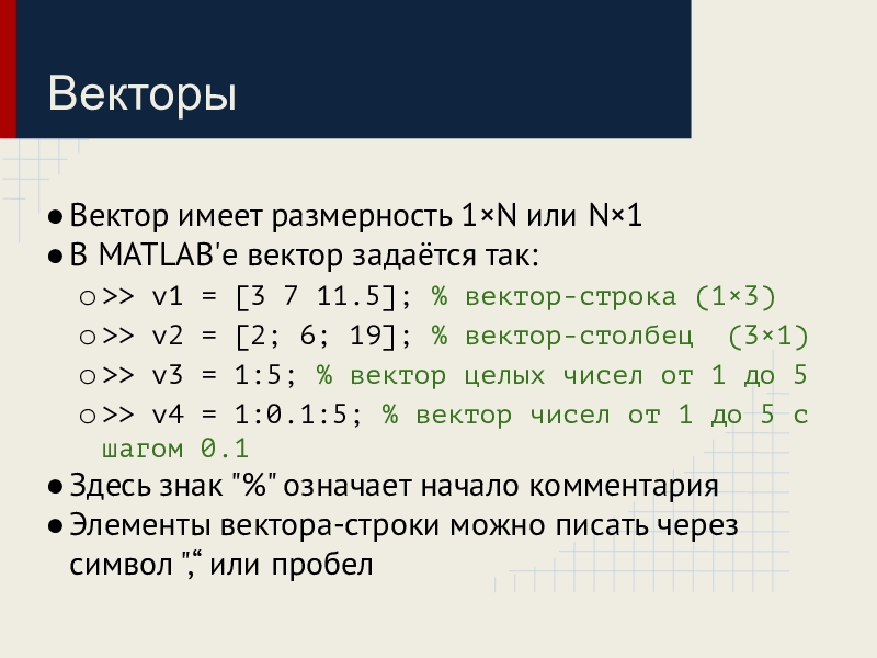 Прикладные программные системы Вектор имеет размерность 1×N или N×1В MATLAB'е вектор задаётся так:>> v1 = Вектор имеет размерность 1×N или N×1В MATLAB'е вектор задаётся так:>> v1 = [3 7 11.5]; % вектор-строка (1×3)>>](/img/tmb/7/613305/64d26b3c0d4e5048244628473d81c7d3-800x.jpg)