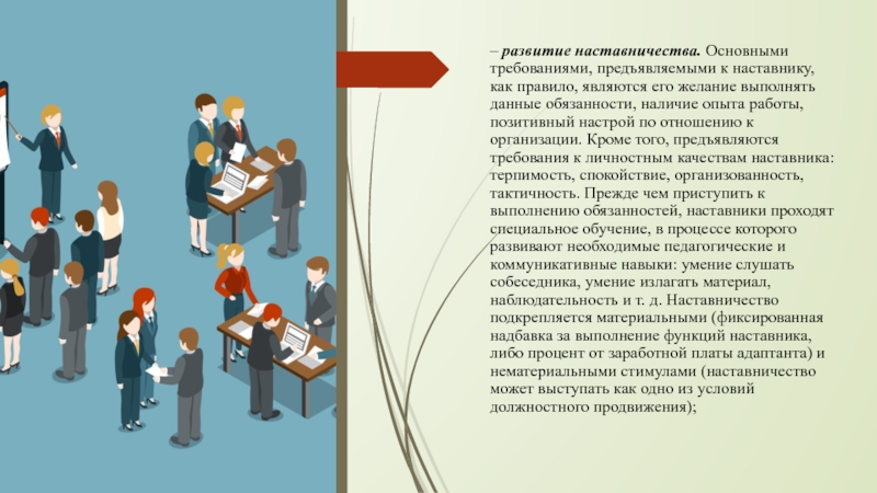 Слайд 15– развитие наставничества. Основными требованиями, предъявляемыми к наставнику, как правило,