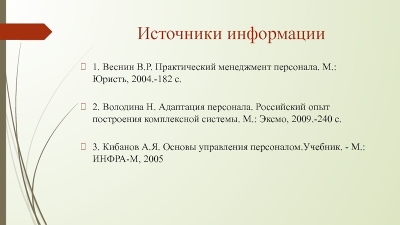 1. Веснин В.Р. Практический менеджмент персонала. М.: Юристь, 2004.-182