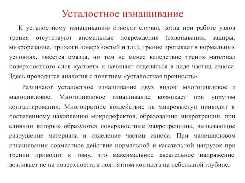 Различают усталостное изнашивание двух видов: многоцикловое и малоцикловое. Многоцикловое изнашивание возникает при упругом контактировании. Многократное воздействие на микровыступ приводит к постепенному накоплению микродефектов, образованию микротрещин, при слиянии которых образуются поверхностные макротрещины, вызывающие разрушение материала и отделение частиц износа. При малоцикловом изнашивании совместное действие нормальной и касательной нагрузок при трении приводит к тому, что максимальное касательное напряжение возникает не на поверхности, а под пятном контакта на небольшой глубине,