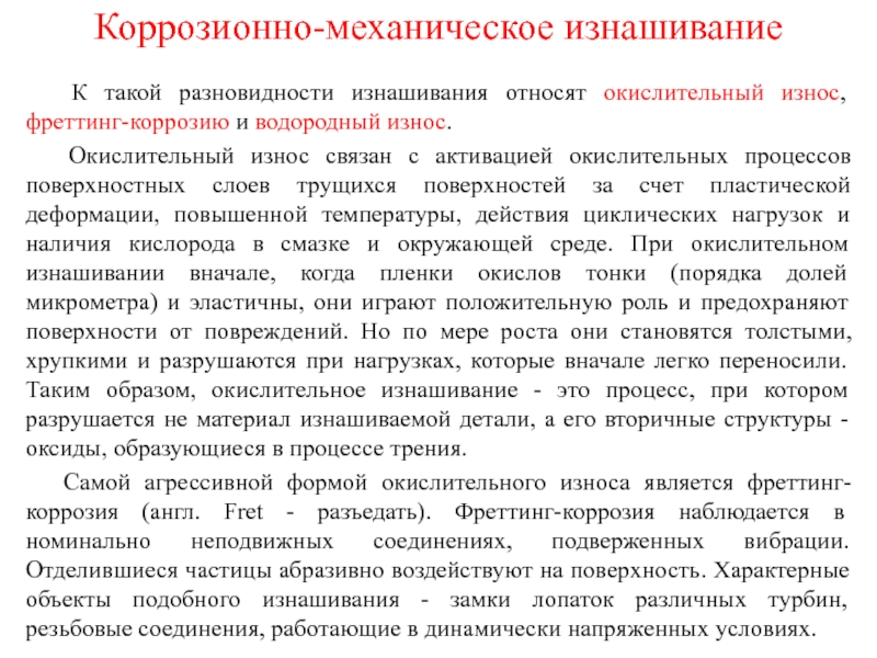 Самой агрессивной формой окислительного износа является фреттинг-коррозия (англ. Fret - разъедать). Фреттинг-коррозия наблюдается в номинально неподвижных соединениях, подверженных вибрации. Отделившиеся частицы абразивно воздействуют на поверхность. Характерные объекты подобного изнашивания - замки лопаток различных турбин, резьбовые соединения, работающие в динамически напряженных условиях.