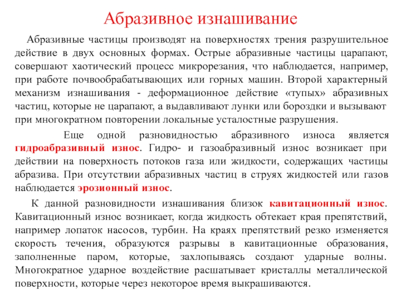 Еще одной разновидностью абразивного износа является гидроабразивный износ. Гидро- и газоабразивный износ возникает при действии на поверхность потоков газа или жидкости, содержащих частицы абразива. При отсутствии абразивных частиц в струях жидкостей или газов наблюдается эрозионный износ.