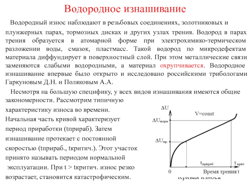 парах трения образуется в атомарной форме при электрохимико-термическом разложении воды, смазок, пластмасс. Такой водород по микродефектам материала диффундирует в поверхностный слой. При этом металлические связи заменяются слабыми водородными, а материал охрупчивается. Водородное изнашивание впервые было открыто и исследовано российскими трибологами Гаркуновым Д.Н. и Поляковым А.А.