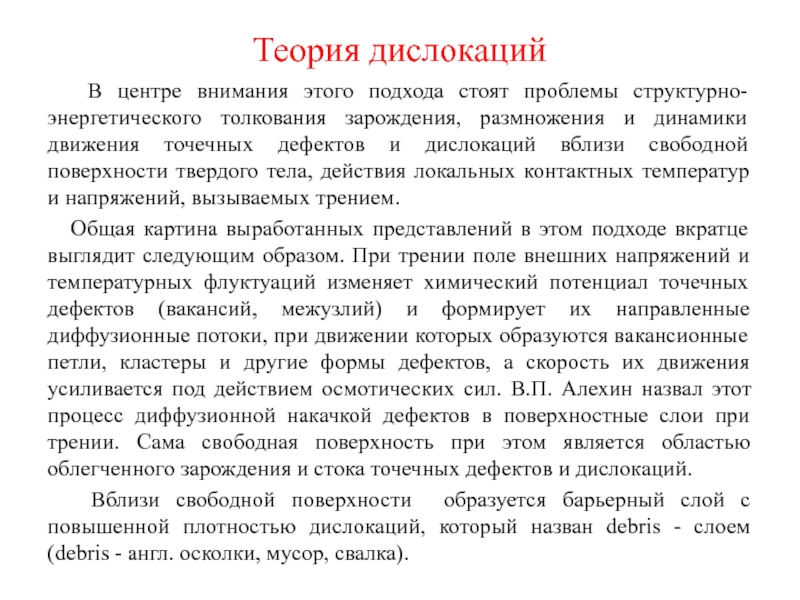 Общая картина выработанных представлений в этом подходе вкратце выглядит следующим образом. При трении поле внешних напряжений и температурных флуктуаций изменяет химический потенциал точечных дефектов (вакансий, межузлий) и формирует их направленные диффузионные потоки, при движении которых образуются вакансионные петли, кластеры и другие формы дефектов, а скорость их движения усиливается под действием осмотических сил. В.П. Алехин назвал этот процесс диффузионной накачкой дефектов в поверхностные слои при трении. Сама свободная поверхность при этом является областью облегченного зарождения и стока точечных дефектов и дислокаций.