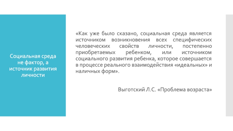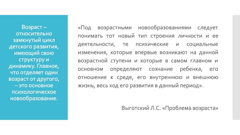 «Под возрастными новообразованиями следует понимать тот новый тип строения личности и ее деятельности, те психические и социальные изменения, которые впервые возникают на данной возрастной ступени и которые в самом главном и основном определяют сознание ребенка, его отношение к среде, его внутреннюю и внешнюю жизнь, весь ход его развития в данный период».