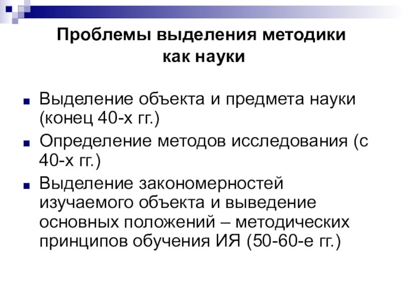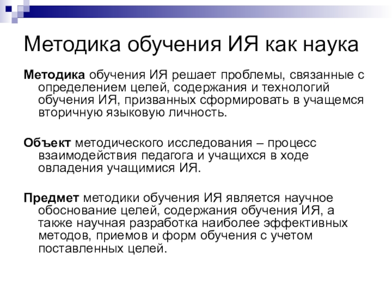 Предмет методики обучения ИЯ является научное обоснование целей, содержания обучения ИЯ, а также научная разработка наиболее эффективных методов, приемов и форм обучения с учетом поставленных целей.