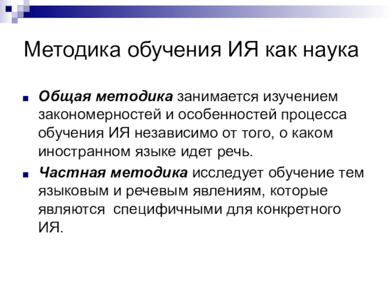 Частная методика исследует обучение тем языковым и речевым явлениям, которые являются специфичными для конкретного ИЯ.
