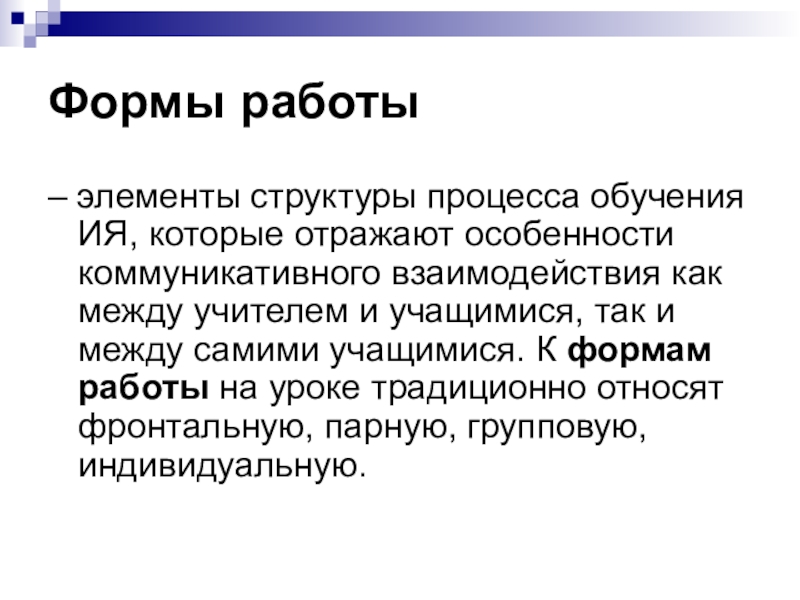 самими учащимися. К формам работы на уроке традиционно относят фронтальную, парную, групповую, индивидуальную.