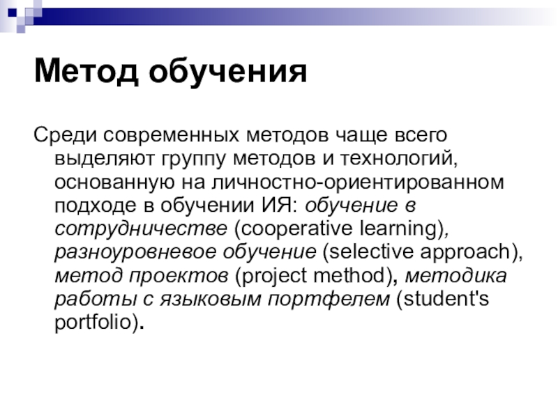 в сотрудничестве (cooperative learning), разноуровневое обучение (selective approach), метод проектов (project method), методика работы с языковым портфелем (student's portfolio).