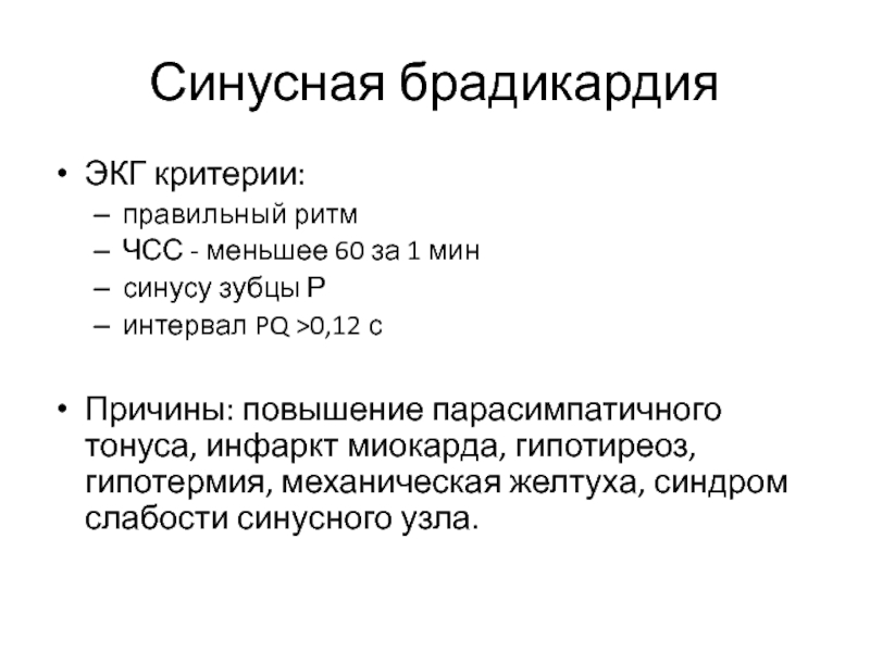 Причины: повышение парасимпатичного тонуса, инфаркт миокарда,