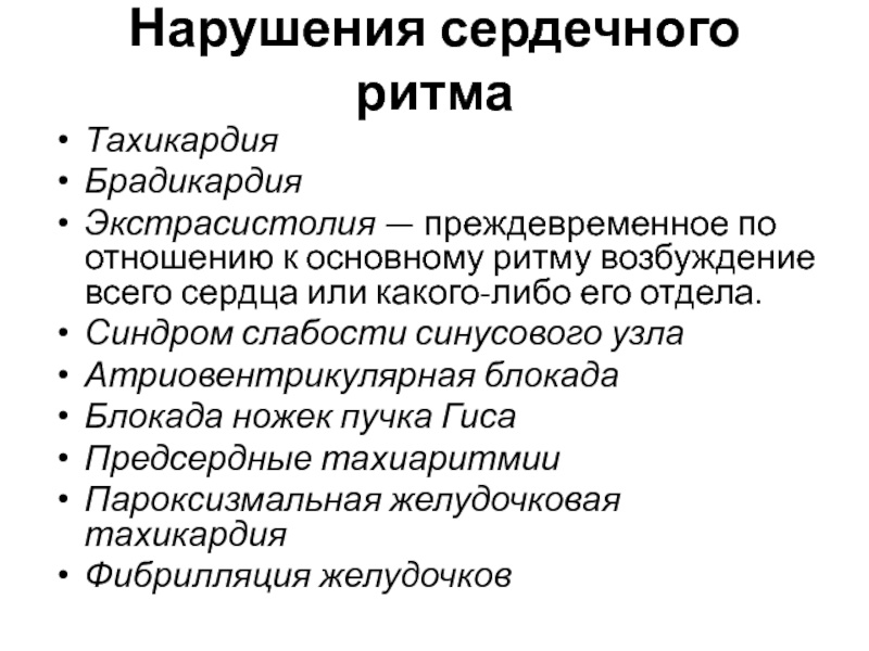 Нарушение ритма — это возникновение в каком-либо участке проводящей системы сердца эктопического очага, берущего на себя роль водителя ритма. Наиболее частым нарушением ритма является экстрасистолия. Кроме того, к нарушениям ритма должны быть отнесены и нарушения частоты сердечных сокращений — тахикардия и брадикардия.