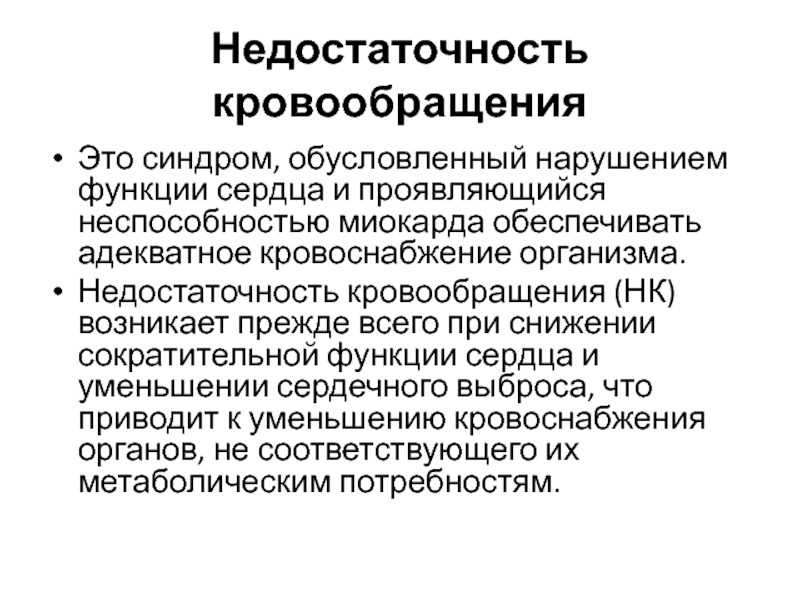 при снижении сократительной функции сердца и уменьшении сердечного выброса, что приводит к уменьшению кровоснабжения органов, не соответствующего их метаболическим потребностям.