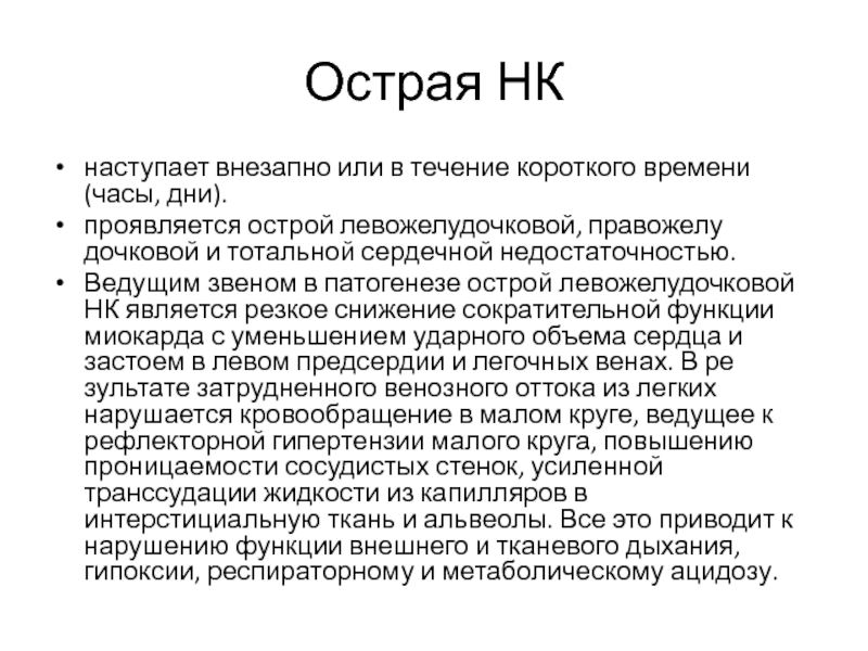 в патогенезе острой левожелудочковой НК является резкое снижение сократительной функции миокарда с уменьшением ударного объема сердца и застоем в левом предсердии и легочных венах. В результате затрудненного венозного оттока из легких нарушается кровообращение в малом круге, ведущее к рефлекторной гипертензии малого круга, повышению проницаемости сосудистых стенок, усиленной транссудации жидкости из капилляров в интерстициальную ткань и альвеолы. Все это приводит к нарушению функции внешнего и тканевого дыхания, гипоксии, респираторному и метаболическому ацидозу.