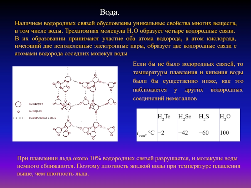 Если бы не было водородных связей, то температуры плавления и кипения воды были бы существенно ниже, как это наблюдается у других водородных соединений неметаллов