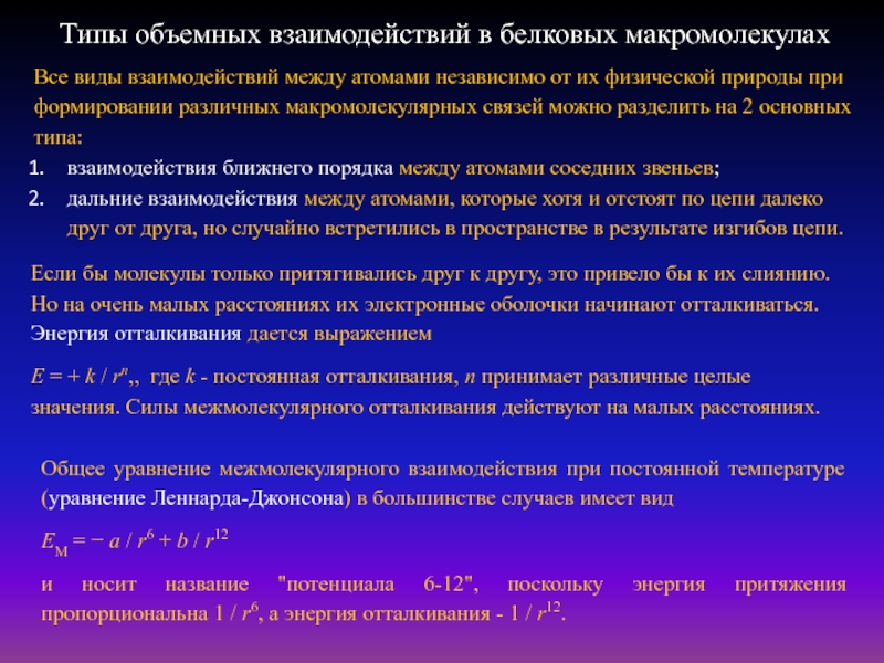 Типы объемных взаимодействий в белковых макромолекулах