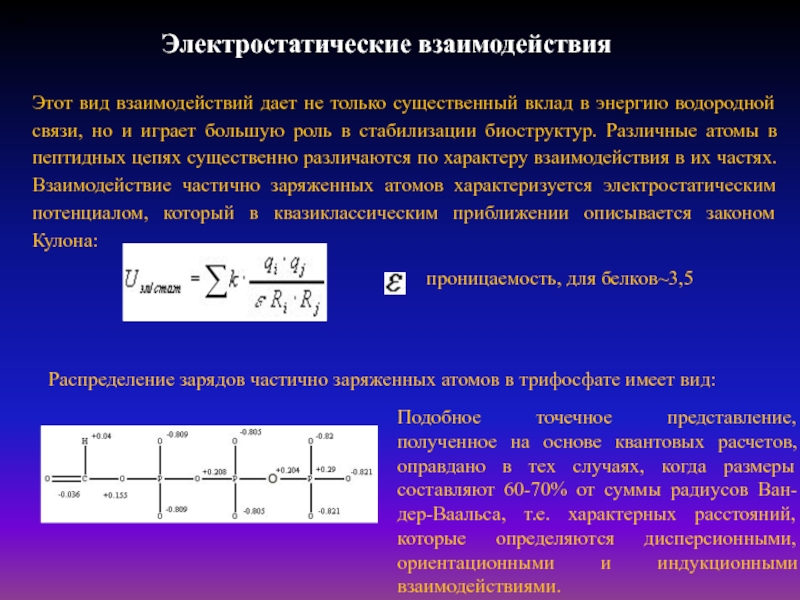 Гидрофобные взаимодействия играют существенную роль в формировании биоструктур, представляя собой один из основных факторов их стабилизации. Эффект взаимодействия полярных групп белка с полярными молекулами воды связан с преобладанием полярных аминокислотных остатков на поверхности белковой глобулы. Однако наряду с этим возможно и взаимодействие посредством водородных связей полярных пептидных связей (NH---OC), принадлежащих разным участкам цепи внутри глобулы. Так как энергия водородных связей между пептидными связями в белке и между ними и водой примерно одинакова, это должно было бы приводить к рыхлой структуре макромолекулы в водном растворе. Однако реально существующая структура упорядочена и компактна и, как можно заключить, в основном определяется именно гидрофобными взаимодействиями.