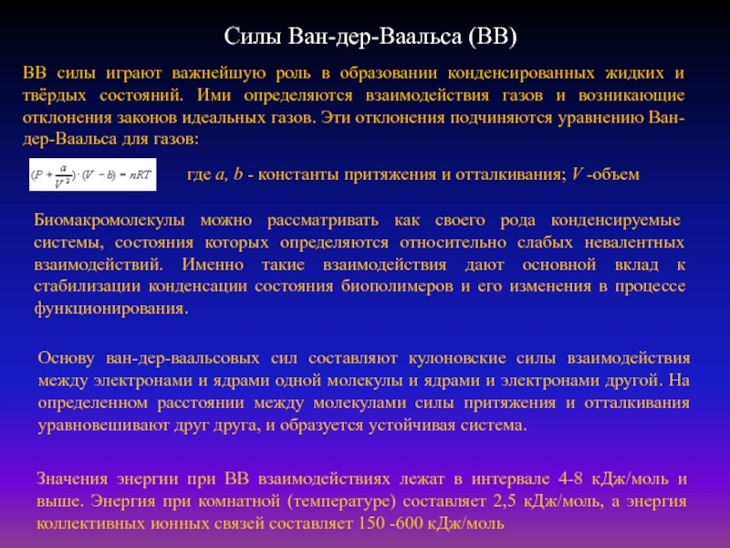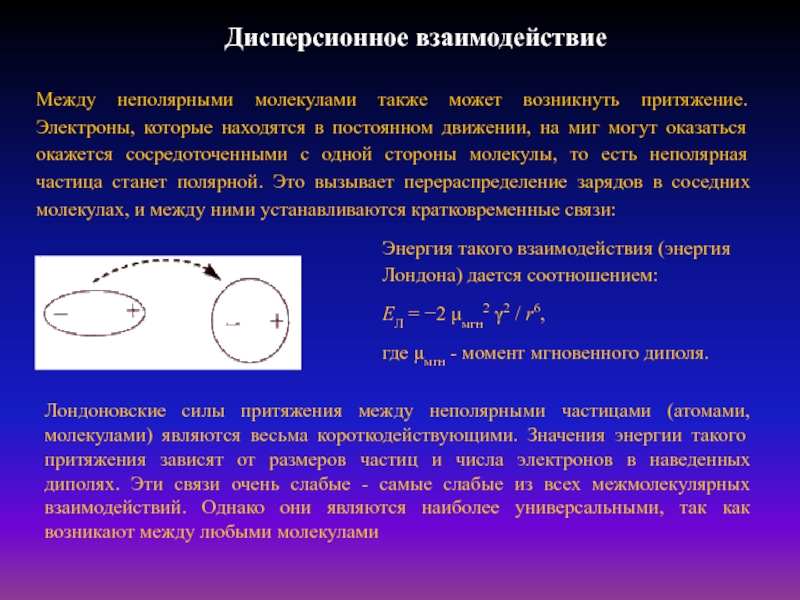 Лондоновские силы притяжения между неполярными частицами (атомами, молекулами) являются весьма короткодействующими. Значения энергии такого притяжения зависят от размеров частиц и числа электронов в наведенных диполях. Эти связи очень слабые - самые слабые из всех межмолекулярных взаимодействий. Однако они являются наиболее универсальными, так как возникают между любыми молекулами
