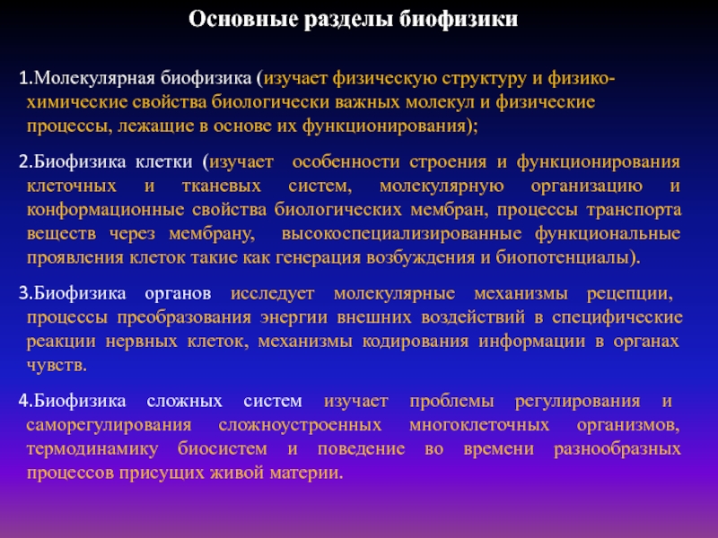 Биофизика сложных систем изучает термодинамику и кинетику биологических процессов.