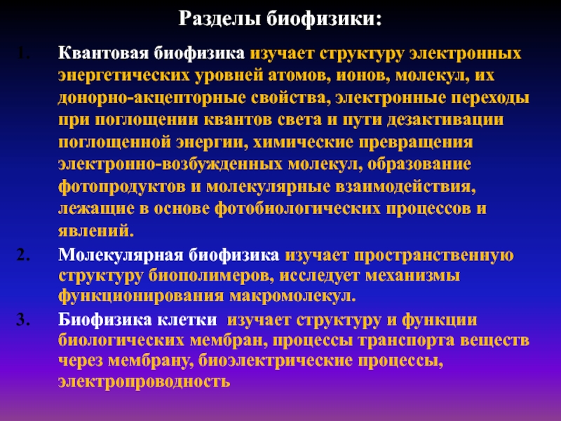 Квантовая биофизика изучает структуру электронных энергетических уровней атомов, ионов,