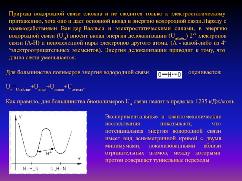 Экспериментальные и квантомеханические исследования показывают, что потенциальная энергия водородной связи имеет вид асимметричной кривой с двумя минимумами, локализованными вблизи отрицательных атомов, между которыми протон совершает туннельные переходы