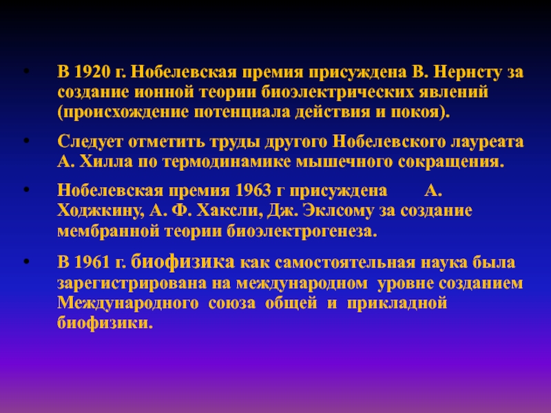 Нобелевская премия 1963 г присуждена А. Ходжкину, А. Ф. Хаксли, Дж. Эклсому за создание мембранной теории биоэлектрогенеза.