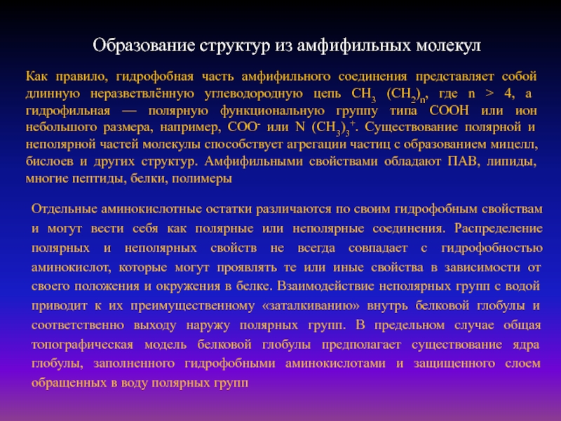> 4, а гидрофильная — полярную функциональную группу типа COOH или ион небольшого размера, например, COO- или N (CH3)3+. Существование полярной и неполярной частей молекулы способствует агрегации частиц с образованием мицелл, бислоев и других структур. Амфифильными свойствами обладают ПАВ, липиды, многие пептиды, белки, полимеры