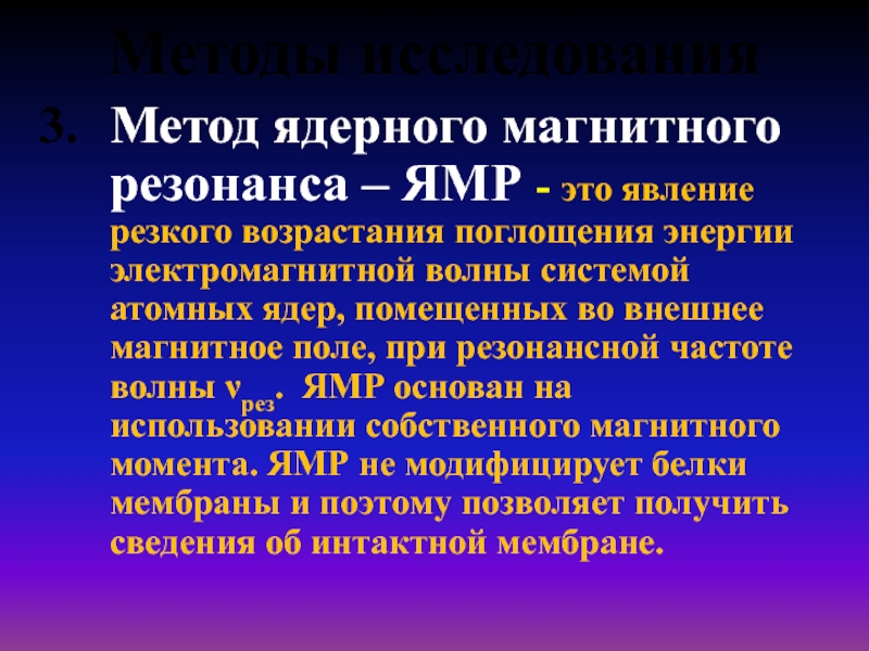 во внешнее магнитное поле, при резонансной частоте волны νрез. ЯМР основан на использовании собственного магнитного момента. ЯМР не модифицирует белки мембраны и поэтому позволяет получить сведения об интактной мембране.