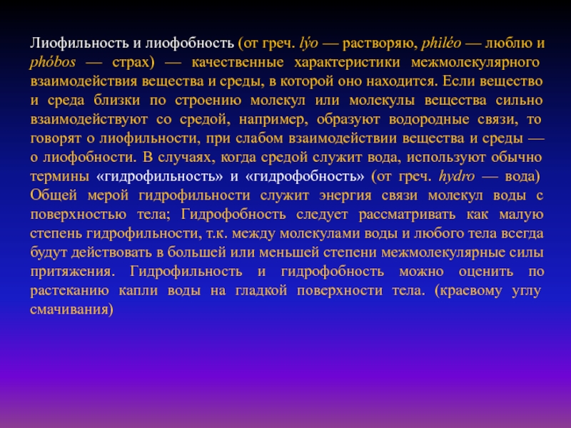 вещества и среды, в которой оно находится. Если вещество и среда близки по строению молекул или молекулы вещества сильно взаимодействуют со средой, например, образуют водородные связи, то говорят о лиофильности, при слабом взаимодействии вещества и среды — о лиофобности. В случаях, когда средой служит вода, используют обычно термины «гидрофильность» и «гидрофобность» (от греч. hydro — вода) Общей мерой гидрофильности служит энергия связи молекул воды с поверхностью тела; Гидрофобность следует рассматривать как малую степень гидрофильности, т.к. между молекулами воды и любого тела всегда будут действовать в большей или меньшей степени межмолекулярные силы притяжения. Гидрофильность и гидрофобность можно оценить по растеканию капли воды на гладкой поверхности тела. (краевому углу смачивания)