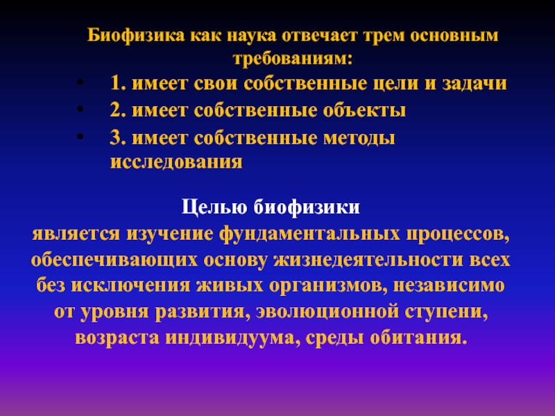 Слайд 5Биофизика как наука отвечает трем основным требованиям: