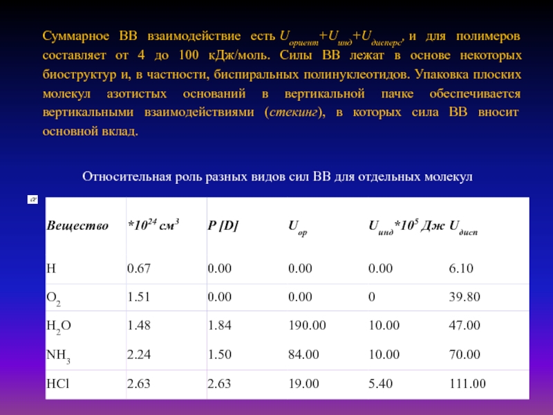 Слайд 22Относительная роль разных видов сил ВВ для отдельных молекул
