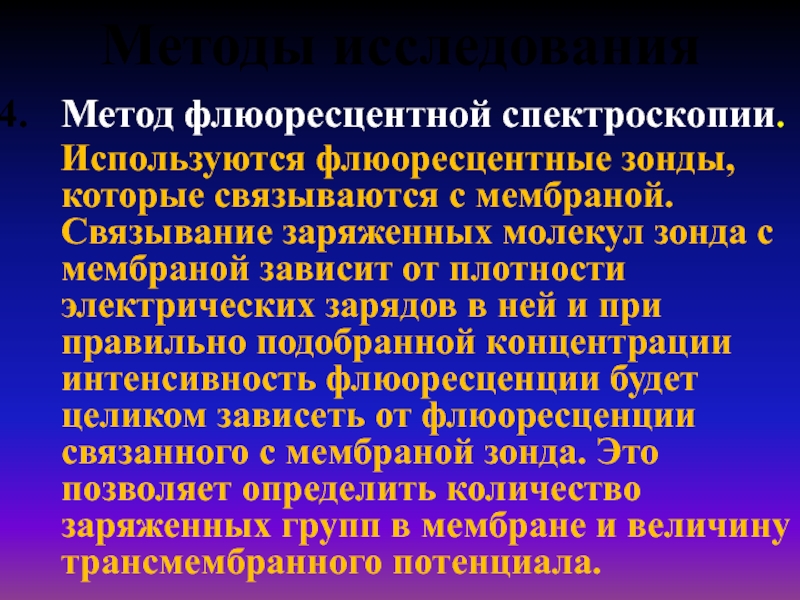 от плотности электрических зарядов в ней и при правильно подобранной концентрации интенсивность флюоресценции будет целиком зависеть от флюоресценции связанного с мембраной зонда. Это позволяет определить количество заряженных групп в мембране и величину трансмембранного потенциала.