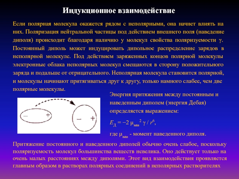(наведение диполя) происходит благодаря наличию у молекул свойства поляризуемости γ. Постоянный диполь может индуцировать дипольное распределение зарядов в неполярной молекуле. Под действием заряженных концов полярной молекулы электронные облака неполярных молекул смещаются в сторону положительного заряда и подальше от отрицательного. Неполярная молекула становится полярной, и молекулы начинают притягиваться друг к другу, только намного слабее, чем две полярные молекулы.