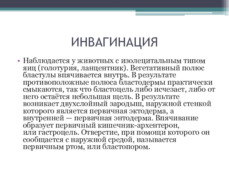смыкаются, так что бластоцель либо исчезает, либо от него остаётся небольшая щель. В результате возникает двухслойный зародыш, наружной стенкой которого является первичная эктодерма, а внутренней — первичная энтодерма. Впячивание образует первичный кишечник-архентерон, или гастроцель. Отверстие, при помощи которого он сообщается с наружной средой, называется первичным ртом, или бластопором.