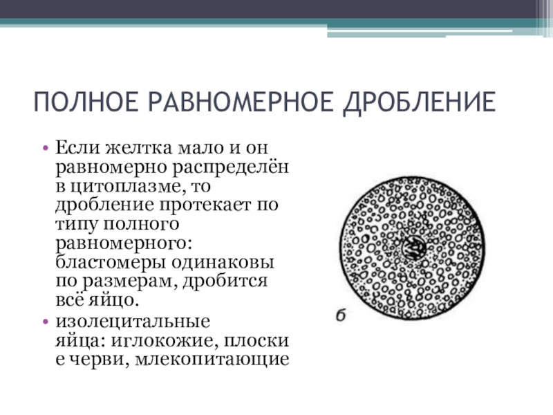 цитоплазме, то дробление протекает по типу полного равномерного: бластомеры одинаковы по