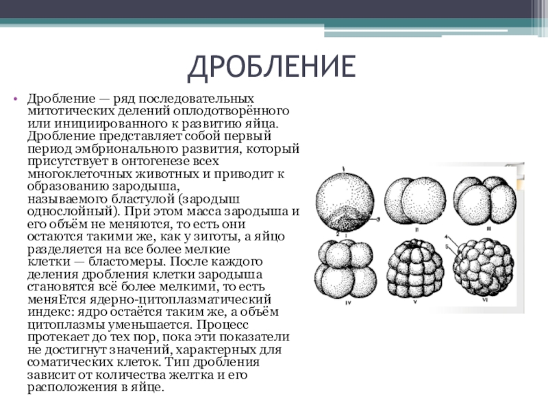 в онтогенезе всех многоклеточных животных и приводит к образованию зародыша, называемого бластулой (зародыш однослойный). При этом масса зародыша и его объём не меняются, то есть они остаются такими же, как у зиготы, а яйцо разделяется на все более мелкие клетки — бластомеры. После каждого деления дробления клетки зародыша становятся всё более мелкими, то есть меняЕтся ядерно-цитоплазматический индекс: ядро остаётся таким же, а объём цитоплазмы уменьшается. Процесс протекает до тех пор, пока эти показатели не достигнут значений, характерных для соматических клеток. Тип дробления зависит от количества желтка и его расположения в яйце.